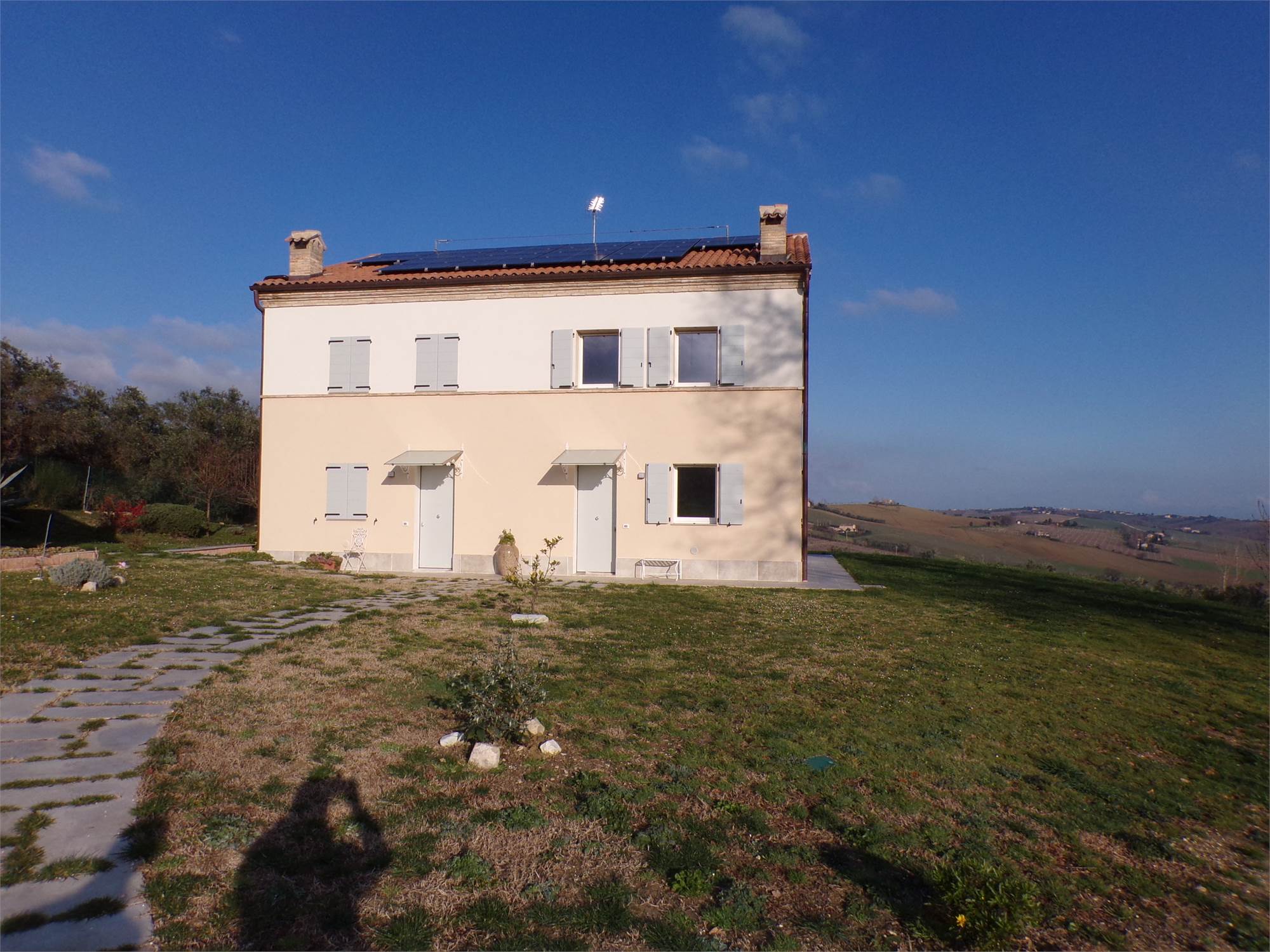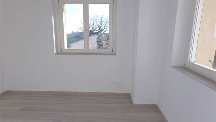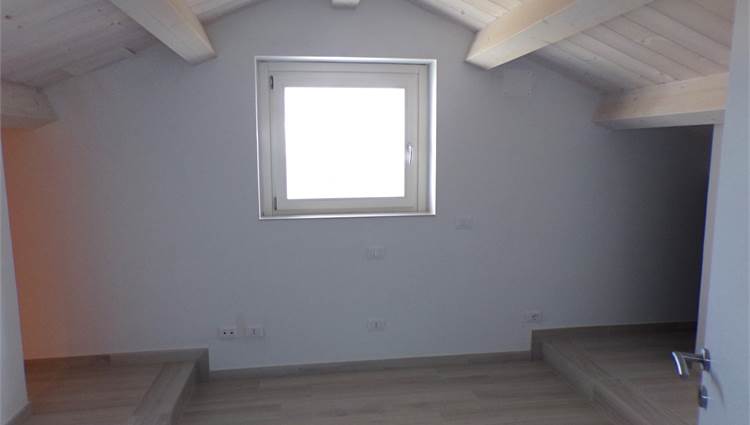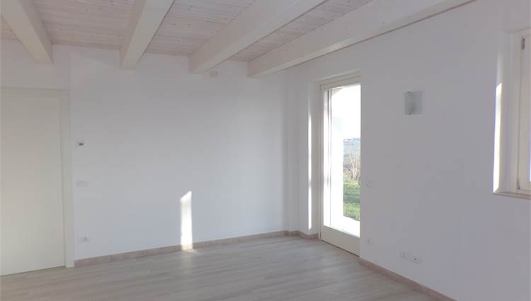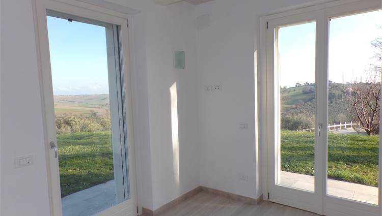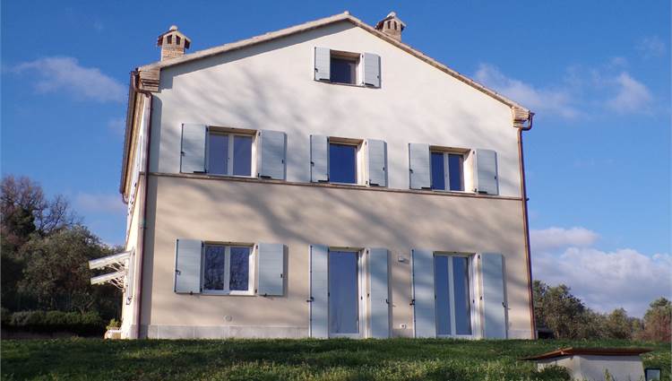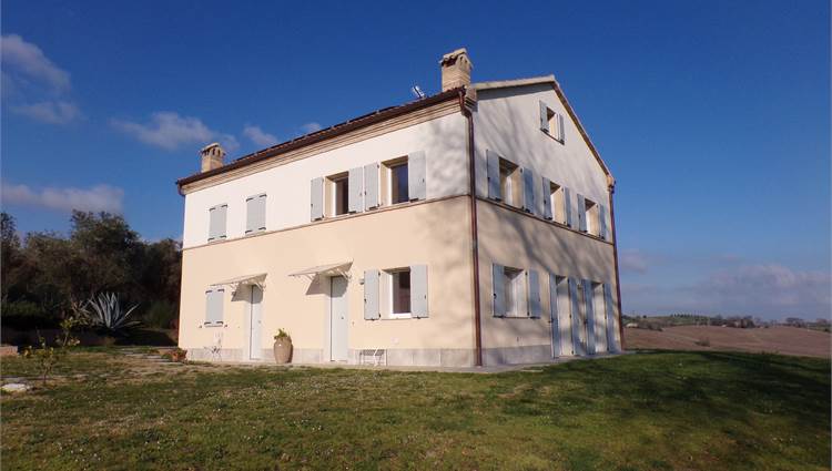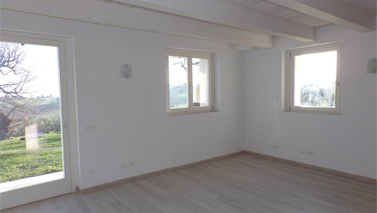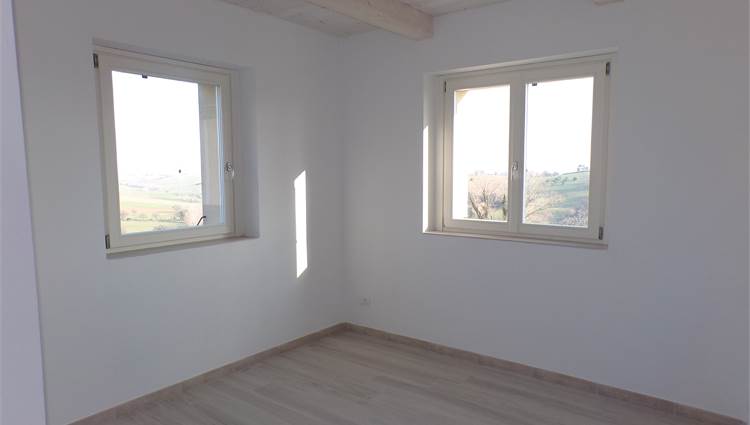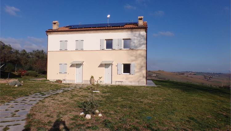 L'abitazione su due livelli oltre mansarda dispone di Ingresso indipendente, soggiorno, cucina ed un bagno al piano terreno; al primo piano due camere da letto con due bagni; al piano mansardato ulteriore stanza con bagno; posto auto e giardino (non sono graditi animali) con vista aperta sulle colline marchigiane.
