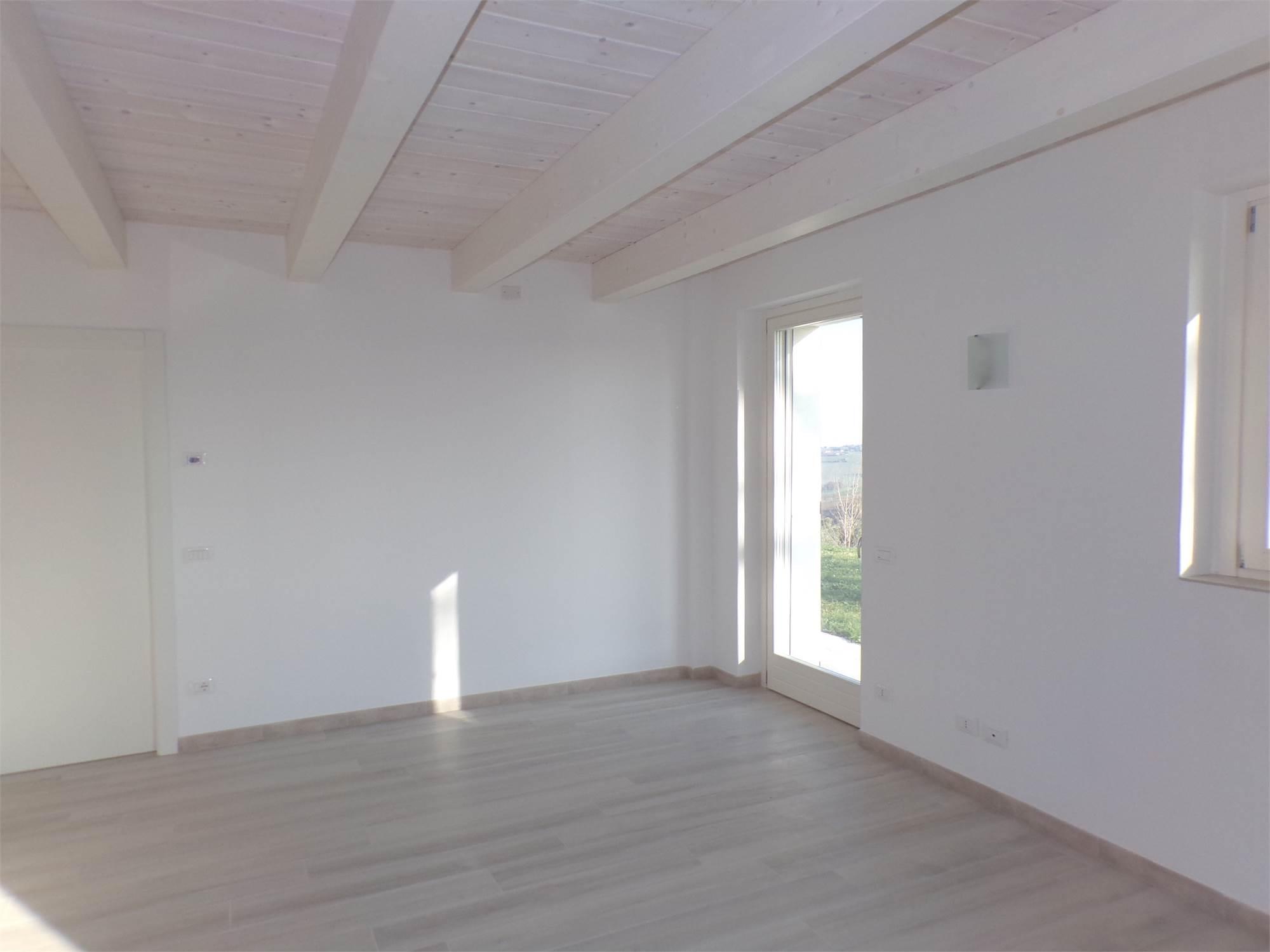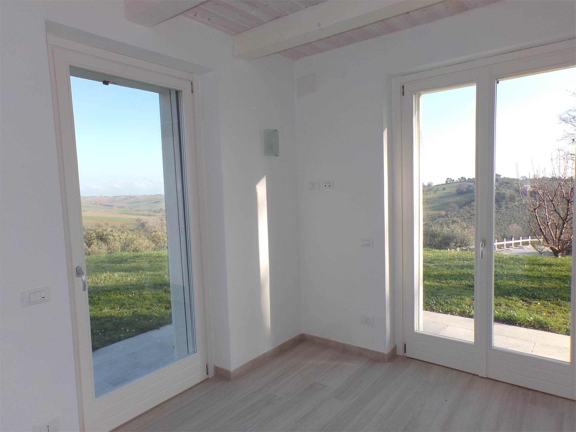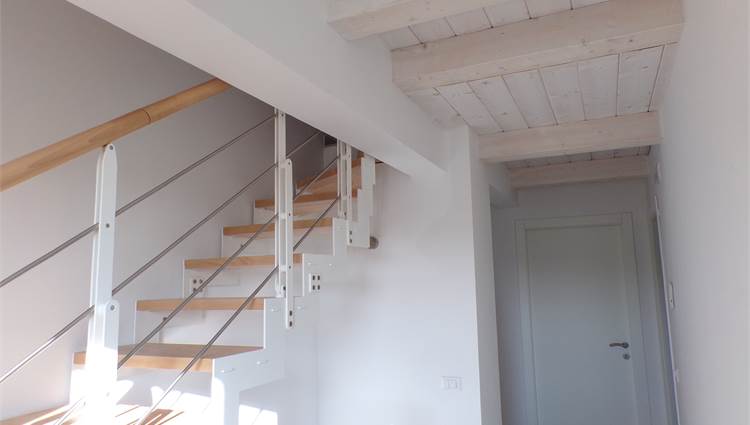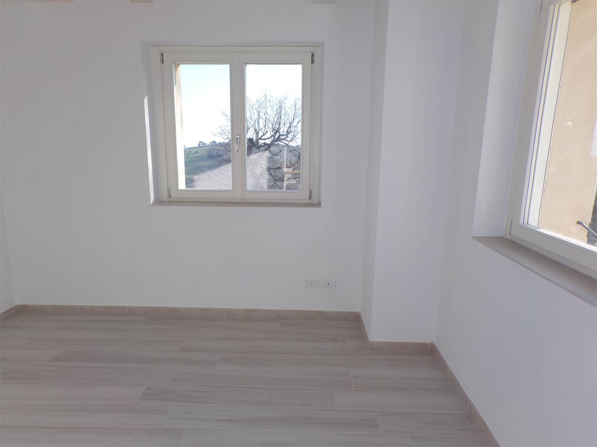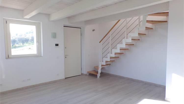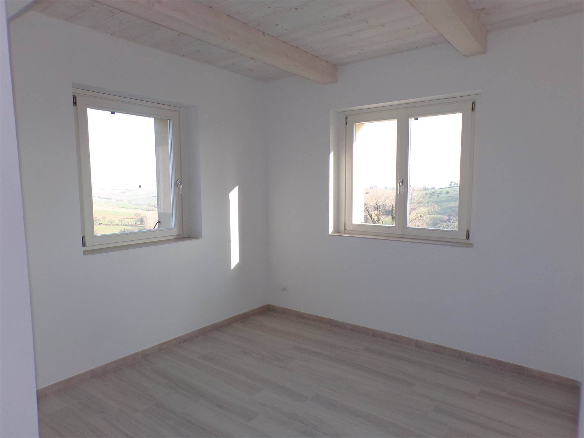 L'abitazione su due livelli oltre mansarda dispone di Ingresso indipendente, soggiorno, cucina ed un bagno al piano terreno; al primo piano due camere da letto con due bagni; al piano mansardato ulteriore stanza con bagno; posto auto e giardino (non sono graditi animali) con vista aperta sulle colline marchigiane.